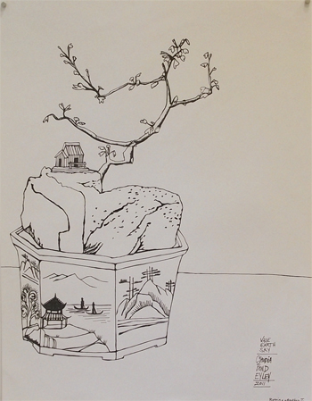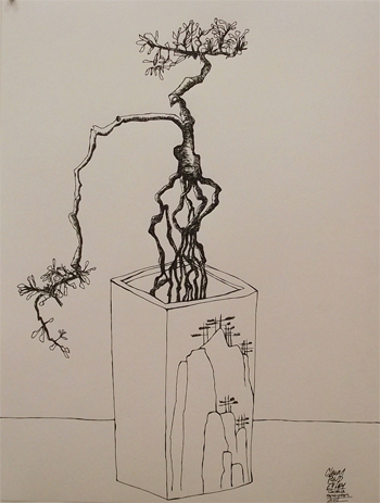 Over the late summer Claudia spent a month visiting with John and sitting in his bonsai garden drawing. She wistfully describes the time “... the ambient weather, the pleasure of going every day, the conversations, the Japanese rice tea served in ever changing beautiful teapots, the sounds of the garden ... I was absolutely entranced”.