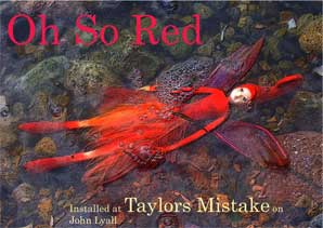 The small brass frog on Ultramarine installed at Haast was found in a market in that same colourful street in Seoul. Lyall carried this in his pocket to Jeju Island off Korea’s southern coast, where he happened upon a scoria garden wall painted bright blue. Just the place for the frog! Later, at Hyundai Beach, Busan, his crimson pohutukawa fairy Oh So Red! was set afloat on the tide, the dye quickly leaking from her skirt until the title became ironic; installed at Taylor’s Mistake. Another frog turns up, this one real, which jumped and basked on Lyall’s pond installation at the Waitakaruru Arboretum and Sculpture Park near Hamilton in 2009 (Infinity).