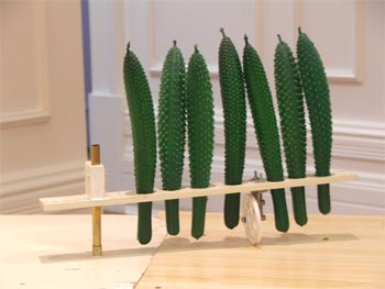 Each sculpture is based around a common object, tables and chairs mostly, with items such as plastic fruit, world globes, rulers and electric motors providing the basis for rotation. Works involving the circulation of water employ pipes and hoses, stainless steel and plastic buckets, cardboard boxes, and water pumps.
