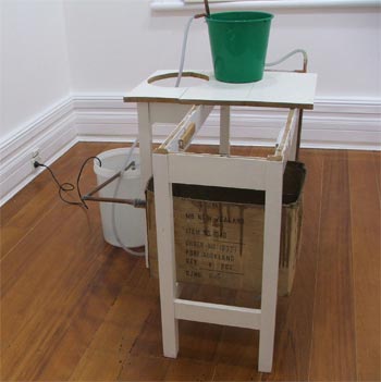 Wooden table, cardboard, plastic buckets, water pump and electric cord.